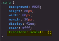 Este valor permite aumentar el tamaño de un elemento X número de veces. Para hacerlo, esta propiedad multiplica las dimensiones del elemento por un valor numérico definido en la propiedad dentro de un paréntesis; es decir, el elemento se puede multiplicar por el número que se desee, volviéndose tan grande como se plazca. También es posible reducir su tamaño multiplicando las dimensiones del elemento por números menores a 1, como por ejemplo "0.5".