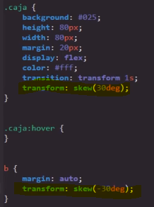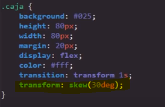 Este valor permite modificar la forma de los elementos añadiéndole X cantidad de grados de inclinación a estos. Ya que esta propiedad trabaja en base a grados, únicamente acepta las siguientes medidas como sus valores: deg (grados), rad (radianes) y grad (gradianes). Entre todas estas medidas, la más recomendable así como la más utilizada son los grados.