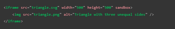 Esta es la tercera forma de incluir el SVG en la página, aunque definitivamente no es la mejor forma de hacerlo; para aplicar este método se utiliza un "iframe" de forma común, haciendo referencia al archivo SVG e incluyendo un elemento "img" con una imagen rasterizada para mostrar en aquellos casos en los que el navegador no acepte la etiquetas "iframe" de la siguiente forma.