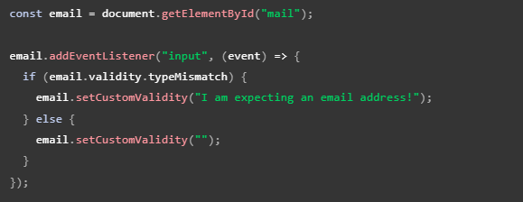 Si la propiedad validity.typeMismatch devuelve falso, llamamos al método setCustomValidity() con una cadena vacía. Esto hace que la entrada sea válida, por lo que se enviará el formulario.