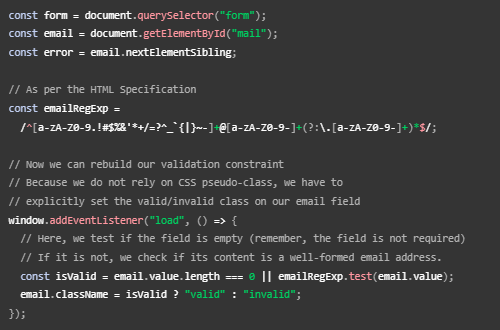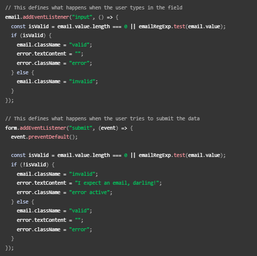 Aquí almacenamos una referencia a la entrada de correo electrónico, luego le agregamos un detector de eventos que ejecuta el código contenido cada vez que se cambia el valor dentro de la entrada.