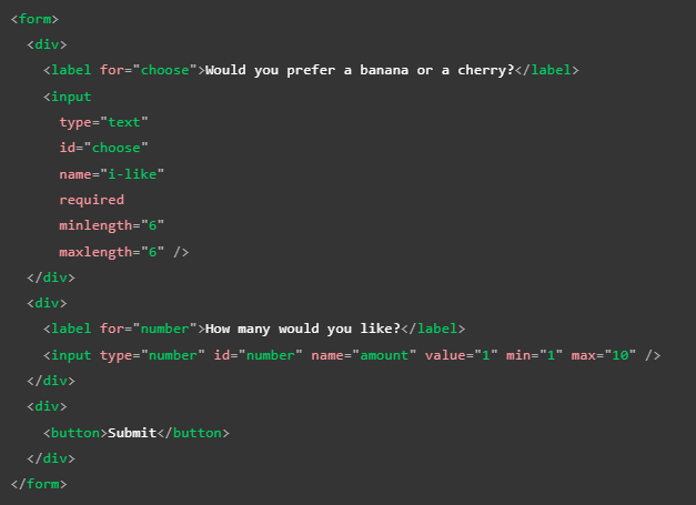 Este código define la cantidad de caracteres que pueden ser añadidos en un cuadro de texto así como el rango numérico que será aceptado en el elemento number, por lo tanto en el elemento texto si no cumple con el rango de caracteres requerido el elemento es tratado como inválido, del mismo modo si el número ingresado en el number no se encuentra entre 1 y 10 será considerado inválido, a continuación se muestra el resultado funcional de este código: