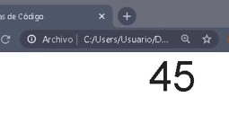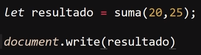 En este segundo ejemplo se llama la función "suma" a la vez que se asigna a una variable llamada "resultado" para poder guardar los datos retornados por esta, se puede apreciar el cómo al realizar el llamado de la función se envían dos datos dentro de los paréntesis de esta (20 y 25), los cuales serán recibidos por las variables de la imagen anterior y operados por la función, de ese modo resultando en el valor 45 el cual es retornado hasta la variable "resultado".