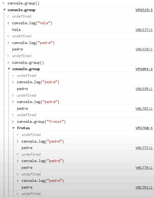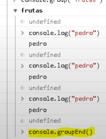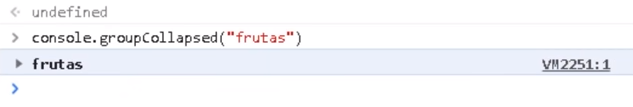 En este ejemplo se aprecia un grupo que acaba de ser generado por "groupCollapsed" con el nombre "frutas" y como se puede ver el grupo se encuentra plegado por defecto.