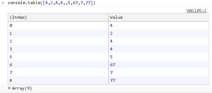 En este ejemplo se puede apreciar una tabla generada en la consola a partir de un array, en esta tabla no se empleó el parámetro adicional (columns), en dicha tabla la columna izquierda revela la posición del elemento mientras que la derecha revela el valor de los datos.