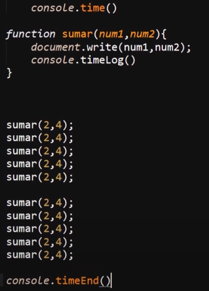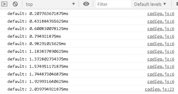 En este ejemplo se puede apreciar el cómo se incorporó un temporizador en una función que imprime datos en pantalla, en el resultado se puede apreciar como con cada ejecución la función "timelog()" marca en la consola el tiempo transcurrido al momento de realizada la función, y como al final la ejecución del temporizador es terminada por la función "timeEnd()".
