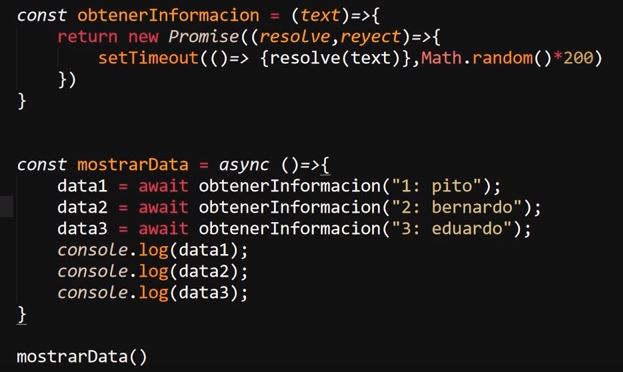 En este ejemplo la promesa recibe un texto y lo retorna con un retraso aleatorio entre 0ms y 200ms, esto para emular cómo el tiempo de espera hasta que una promesa se complete puede variar, por otro lado la función "mostrarData" realiza tres llamados a la promesa "obtenerInformacion" con diferentes datos en cada llamado, y luego procede a imprimir los resultados de las promesas en consola.