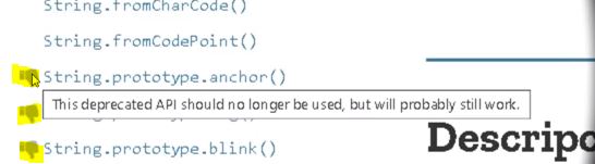 El símbolo de pulgar abajo es usado por Mozilla para indicar que un recurso o código no es recomendado y probablemente se encuentre obsoleto, lo que significa que no se debe usar y es probable que no funcione.