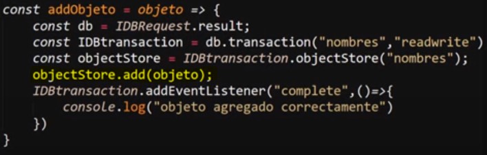 Finalmente, se utiliza el método "objectStore" para indicar sobre qué almacén operaremos y el método ".add" para pasar el objeto en cuestión.