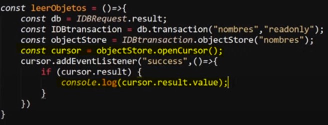 Para leer datos se utiliza el método ".openCursor()", el cual permite recorrer los objetos almacenados. Este método también requiere una transacción de tipo "readonly".
