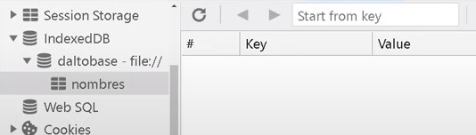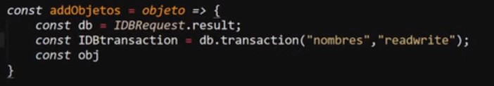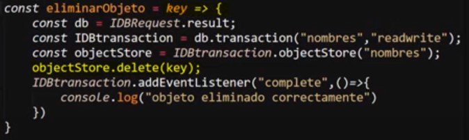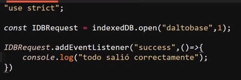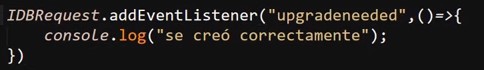Nota: Si la constante se nombra de la misma forma que "indexedDB", es necesario realizar la solicitud como "window.indexedDB", ya que de lo contrario JavaScript no ubica al objeto; en su lugar, lo interpreta como un llamado a dicha constante.