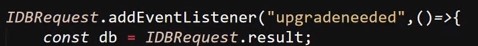Para crear un almacén de objetos es necesario acceder a la base de datos a través de la propiedad ".result" de la solicitud. Esto se debe a que en la constante "IDBRequest" no se almacena la base de datos en sí, sino la solicitud; la base de datos se obtiene como un resultado exitoso de esta.