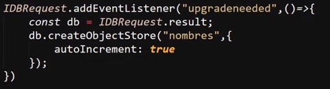 Nota: Una alternativa a "autoIncrement" es "keyPath", el cual permite definir una propiedad del objeto como llave primaria.