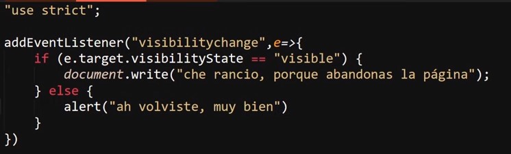 En este ejemplo se puede observar cómo se inicializa el escucha de eventos con "visibilitychange", se le pasa el parámetro "e" a la función flecha y esta, según cuál sea el valor de la propiedad "visibilityState", mostrará un mensaje u otro. De ese modo, cuando el usuario abandone la pestaña saltará un mensaje, y luego saltará una alerta cuando este retorne.