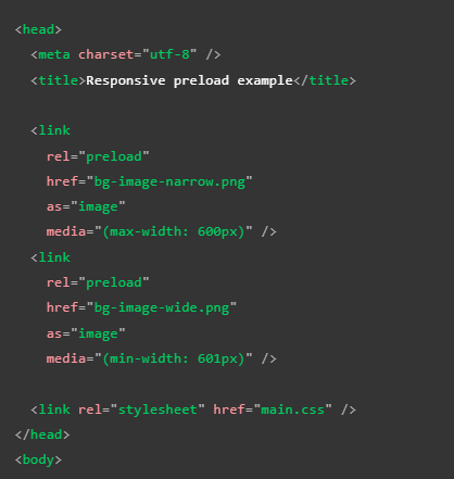 Una buena característica de los elementos "link" es su capacidad para aceptar atributos "media"; esto le permite aceptar "media types" (tipos de media) o "media queries" (consultas de medios), lo que permite realizar una precarga receptiva como se puede apreciar en el siguiente ejemplo: