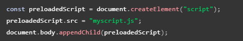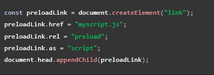 Aquí creamos una instancia de HTMLLinkElement y luego la adjuntamos al DOM; esto significa que el navegador precargará el archivo myscript.js, pero aún no lo usará. Para usarlo se podría hacer esto: