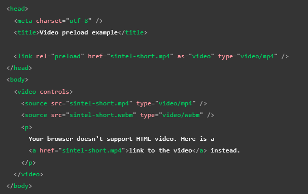 Este código de ejemplo asigna un video.mp4 para que se cargue previamente en todos aquellos navegadores que tengan soporte para videos mp4; por lo tanto, para los usuarios de estos navegadores la interacción con el video será más suave y receptiva en comparación con aquellos navegadores que no sean compatibles con el recurso.