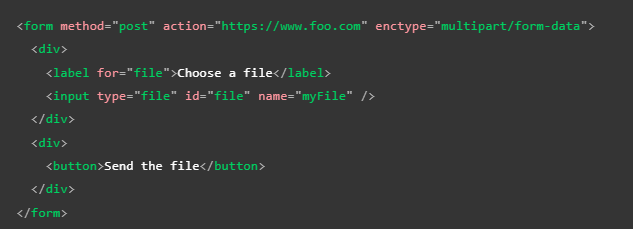 Para este tipo de casos existe el atributo "enctype". Este atributo es realmente importante ya que se encarga de definir el valor del encabezado del tipo de contenido incluido en la solicitud HTTP; en otras palabras, le indica al servidor qué tipos de datos está recibiendo. Su valor por defecto es application/x-www-form-urlencoded, lo que significa "estos son datos de formularios que han sido codificados en parámetros de URL".