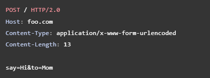 Los datos enviados se siguen enviando en los conjuntos "nombre/valor", al igual que se sigue utilizando el ampersand (&) para delimitarlos; por otro lado, el encabezado Content-Length indica el tamaño del cuerpo y el encabezado Content-Type indica el tipo de recurso enviado al servidor.